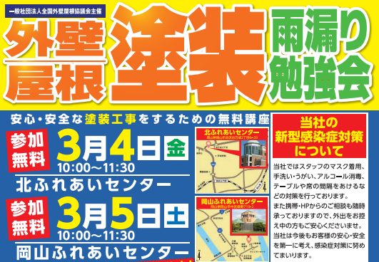 いつも塗人ブログをご覧いただきありがとうございます😊 株式会社ミナンは岡山市北区、南区、中区、東区、倉敷市、都窪郡、赤磐市を中心に 高品質&低価格な外壁塗装・屋根工事・雨漏り修理をご提供する専門店です。 🍂11月の塗人の外壁・屋根塗装・雨漏り勉強会!🍂 7月から4カ月ぶりの塗人外壁塗装&屋根塗装勉強会! 1日目から沢山の方にご来場いただきまして、誠にありがとうございます!✨ この勉強会では、岡山で外壁塗装や屋根塗装をご検討の方に とても為になる講座内容です(^^) □カラーベストがアスベスト含んでるかどうかってわかるの? □近所の人が外壁塗装していたけど自分の家の塗装時期はいつ? □ほかの業者からこんなこと言われたけど実際はどう? □信頼できる業者は?ミナンはどうなの? 等々、建物に関する疑問やご質問にお答えさせて頂きます♪ お気軽にお尋ねください(*^-^*)✨ また、講座だけではなく個別にご自宅の外壁や屋根の事を相談したい、、 建物診断を検討しているが、まずは話を聞いてもらいたい! という方向けに、勉強会終了後の個別相談もお伺いしております! 今日の講座は時間が合わず来れなかった💦という方、 次回は3日後、11/13(日)の10:00~を予定しております♪ 【✎勉強会2日目✎】 11月13日(日) 10:00~11:30🌸北ふれあいセンター 第一研修室 :岡山市北区谷万成2丁目6-33 年内最後の外壁塗装・屋根塗装勉強会となりますので 外壁塗装・屋根塗装・雨漏り工事などを検討している。 まずは話だけでもきいてみたい! と、いう方は是非11/13(日)の勉強会にお越しください(*^-^*) ご予約は下記電話番号・メールより受付中です!!✨ 👇👇 岡山の外壁塗装、屋根塗装、屋根カバー工事、 雨漏診断、雨漏り修理のことなら 株式会社ミナン|塗人|まで♬ ✆:0120-957-951 📥:info@minan.jp ☆岡山の外壁塗装・屋根工事等2500件以上のBefore&After 岡山市を中心とした豊富な施工事例はこちら ☆まずは塗装の基礎知識を知りたい方(WEBでのご来店予約で500円相当のプレゼントあり) 岡山市内2店舗展開中のショールーム来店予約はこちら ☆無料外壁診断・屋根ドローン診断・雨漏り診断をお考えの方 1級塗装技能士、外壁診断士による建物劣化調査はこちら ☆株式会社ミナンで施工したお客様の声を聞きたい方 お客様の声はこちら(youtube動画あり) ===================== 岡山市の外壁塗装&屋根塗装専門店 株式会社ミナン|☆塗人 0120-957-951 [岡山本店ショールーム] 〒700-0975 岡山県岡山市北区今7丁目22-22 TEL:086-239-7676 FAX:086-239-7979 [岡山中央店ショールーム] 〒703-8271 岡山県岡山市中区円山90-9 YSタウン円山101 TEL:086-230-1771 FAX:086-230-1772 =====================