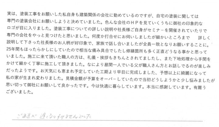 岡山市北区の外壁塗装専門店 (有)御南塗装工業☆塗人です 昨年、最後の塗装現場見学会を開催させて頂いた、 岡山市北区のB様邸、遅くなりましたが、 完成の様子をご紹介いたします♬ 施工前全景 施工前全景 屋根カラーベスト施工前 色のご提案に関しては弊社のカラーシミュレーションシステムにて おすすめのプランとお客様のご要望を合わせたイメージ作成を行いました♬ 実際にはもう6パターンを加えてご提案させて頂き、 概算イメージから、実際の色見本板調整をかけていき、 最終の配色決定をいたしました。 施工後全景 施工後全景 屋根施工後 塗装施工箇所は外壁サイデイング(目地シーリング防水工事含む)、 屋根カラーベスト(タスペーサー通気工法含む)、 雨樋、軒天井、破風、幕板、ベランダパネル、シャッターボックス、 土台水切板金、玄関ドア、勝手口ドア、一部窓枠等 基本、塗装できる部位については全面塗装の仕様となります。 塗装仕様は全面、KFケミカル社製の超高耐久フッソ塗料での仕様で 部位とご予算によって、水性タイプ、溶剤タイプ、1液タイプ、2液タイプ と仕様分けをしております。 ☆☆☆☆☆☆☆☆☆☆☆☆☆☆☆ KFケミカル認定施工店情報 https://worldcera.jp/member/ ☆☆☆☆☆☆☆☆☆☆☆☆☆☆☆ 塗装工事中には現場見学会&住まいの塗替え相談会も開催させて頂き、 お客様はじめ、ご近隣の方々には多大なご協力を賜り感謝お礼申し上げます。 https://www.minan.jp/information/ivent/8390.html 当物件に関する塗装仕様や配色プラン等に関しての 詳しいお問い合わせ、ご質問等は 有限会社 御南塗装工業 📞0120-957-951 までお気軽にお問い合わせください。