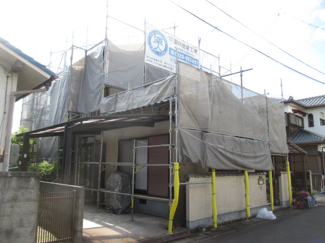 岡山市南区にて築37年のセメント瓦屋根・モルタル外壁塗装工事開始です☆