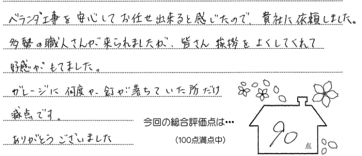 ベランダ工事を安心してお任せ出来ると感じたので、貴社に依頼しました。