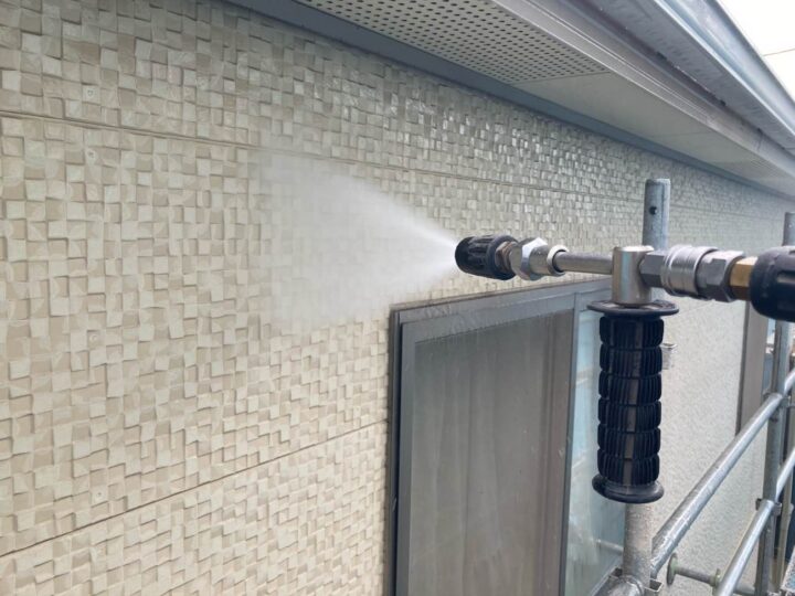 高圧洗浄によりチョーキングなどの汚れを落としていきます。シーリング打ち替え
