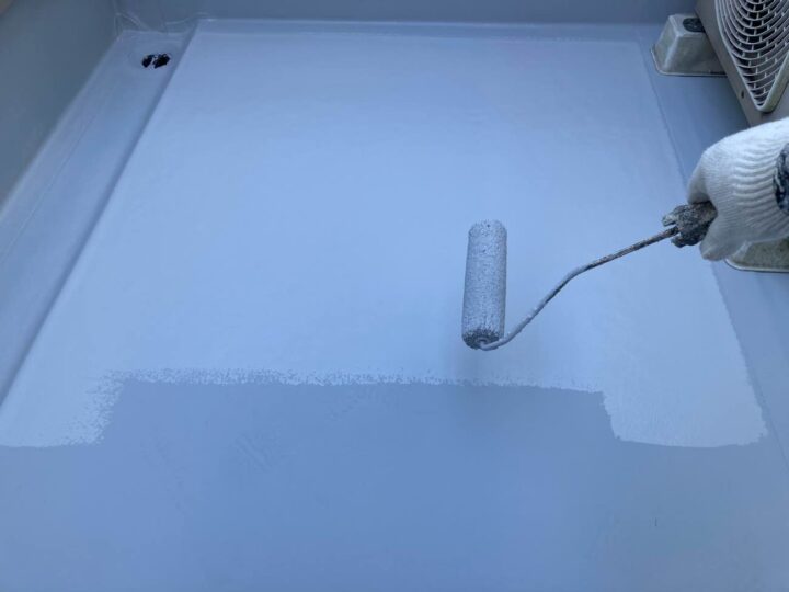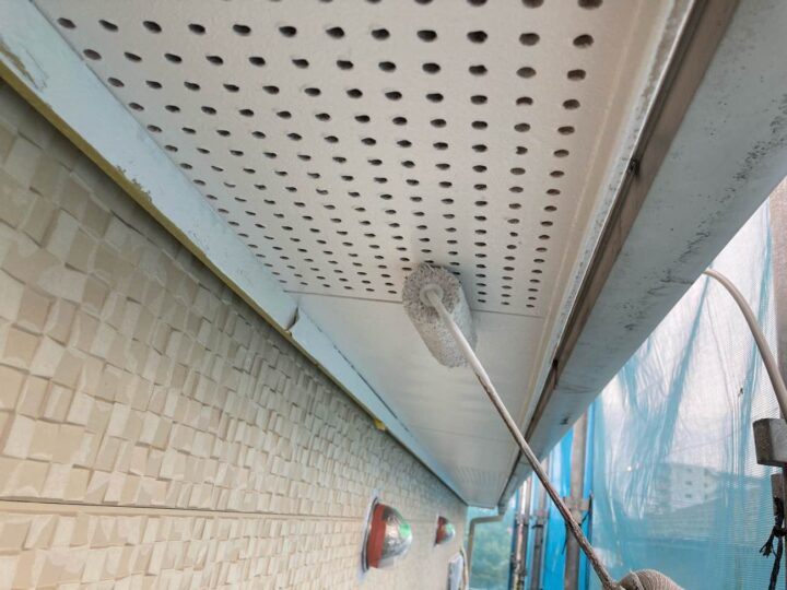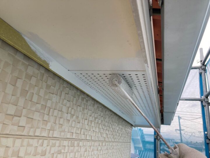 防カビ効果のある専用の塗料1回目を塗装します。軒天