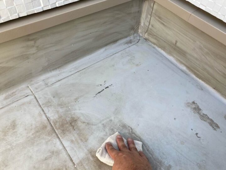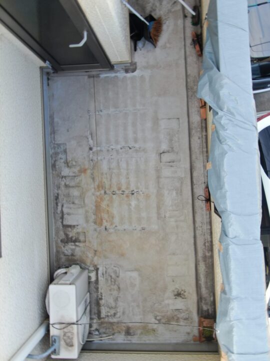 高圧洗浄で苔などの汚れを落としていきます。ベランダ床