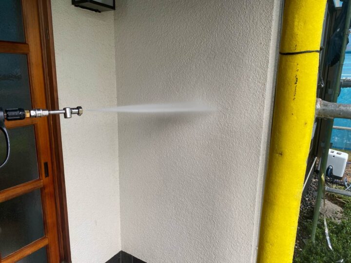 高圧洗浄により、チョーキング等の汚れを落としていきます。外壁
