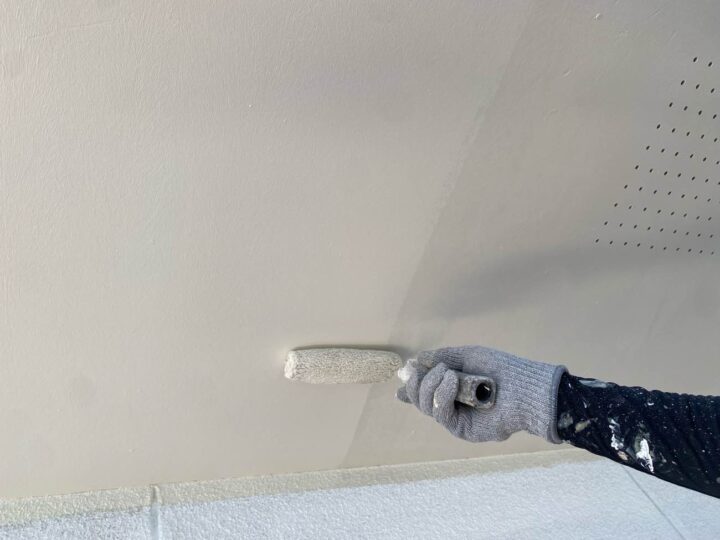 中塗り乾燥後、上塗りを行います。軒天(ケイカル部分)